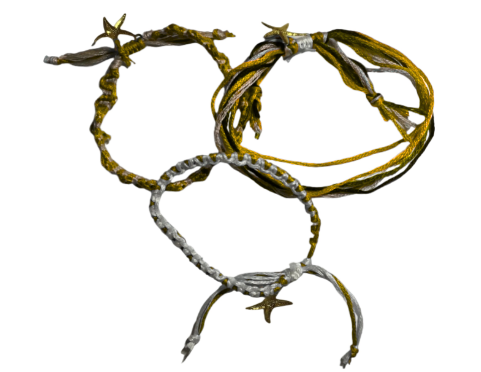 Bring the beach wherever you go with this handcrafted macrame bracelet, woven with soft, ocean-toned threads and accented by a delicate gold starfish charm. Each bracelet is carefully knotted by hand-making every bracelet truly one of a kind.